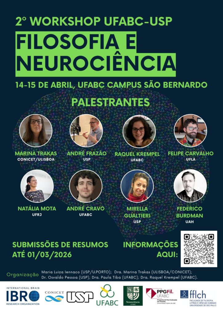 O evento ocorrerá nos dias 14 e 15 de abril de 2026, no campus de São Bernardo do Campo da UFABC. Submissões de resumos para apresentações orais e pôsteres serão recebidas até o dia 1º de março de 2026. As submissões estão abertas a pesquisadoras e pesquisadores de quaisquer instituições. Recebemos contribuições nas áreas de Filosofia, Neurociências e Psicologia Cognitiva, com especial interesse em abordagens interdisciplinares que integrem esses campos.